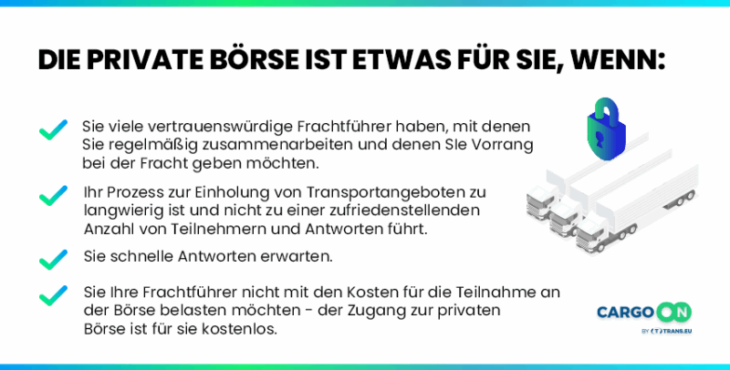 Die private Frachtenbörse, eine neue Spot-Lösung von Trans.eu, garantiert schnelle Antworten und sichere Transaktionen mit den Frachtführern Ihres Vertrauens.