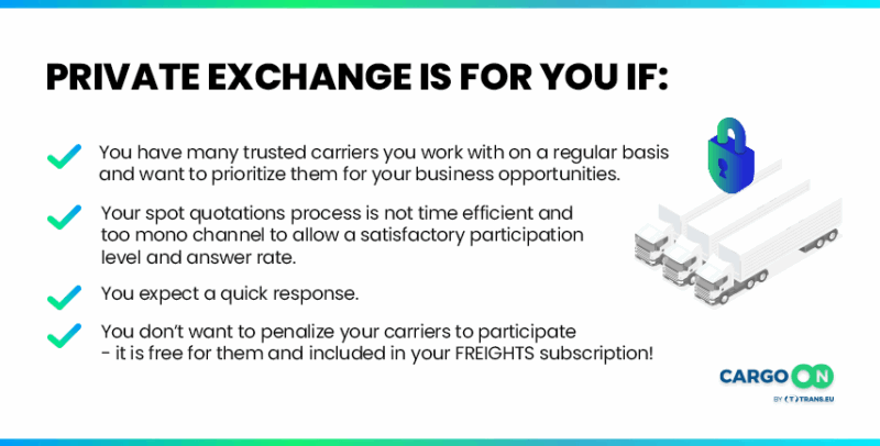 Private Freight Exchange, a new spot solution offered by Trans.eu guarantees quick responses and secure transactions with your trusted carriers.