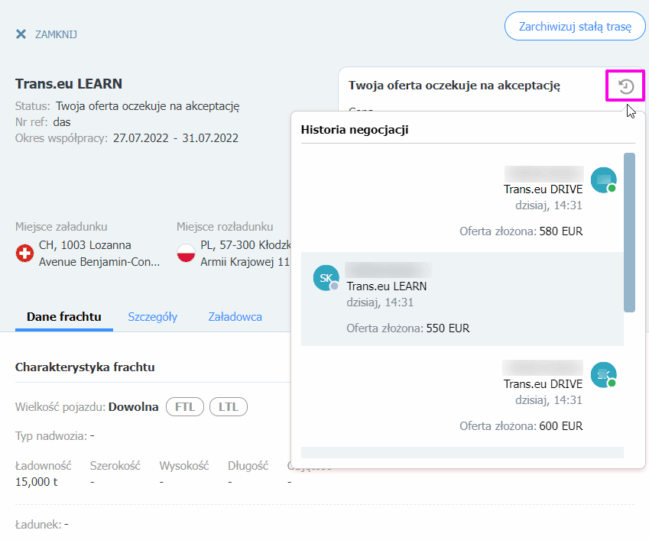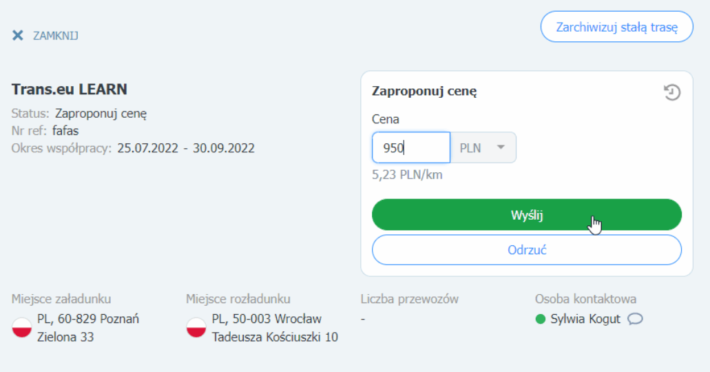 Teraz tworząc stałą trasę, załadowca może rozpocząć negocjacje z przewoźnikami bez podawania stawki startowej. Takie rozwiązanie najlepiej sprawdzi się w przypadku, gdy Twoi przewoźnicy nie są w stanie zaspokoić zapotrzebowania na przestrzeń przewozową. Dzięki temu najlepiej wykorzystasz dostępne capacity i zawsze pojedziesz za najlepszą dostępną stawkę. Załadowca od tej pory będzie miał pewność, że jego propozycje stawek kontraktowych nie są odrzucane ze względu na zbyt niską wartość. Zabezpiecz się również przed przepłacaniem, które powoduje wzrost kosztów transportu.