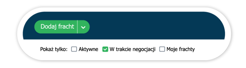 Dodatkowym ułatwieniem przy zakładkach zaakceptowane i archiwum jest filtr “pokaż tylko moje”. Gdy skorzystamy z tej opcji system pokaże frachty tylko te, które Ty wystawiłeś. Przyspiesza i poprawia to znacząco pracę szczególnie gdy z Platformy korzysta wielu użytkowników. Gdybyś jednak potrzebował przejrzeć wszystkie oferty, wystarczy, że odznaczysz odpowiedni check box.