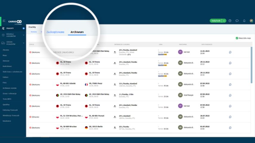 - wszystkie opublikowane przez Ciebie i Twoją firmę frachty;