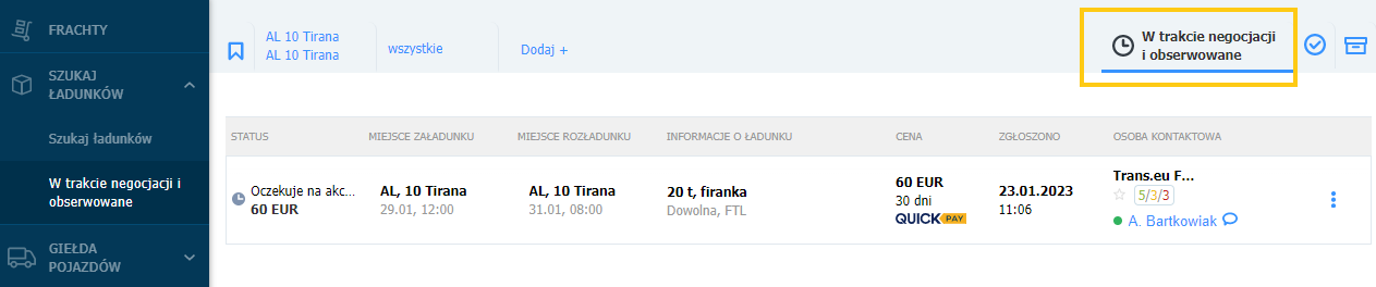 - Zaakceptowane (wszystkie Twoje oferty frachtów, które zakończyły się formalną transakcją na Platformie);